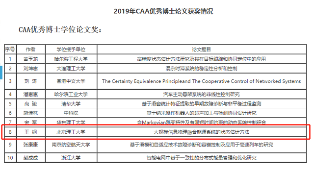 北京理工大学荣获2019年度CAA博士学位论文奖