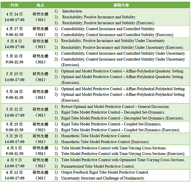 为对标国际顶尖高校,加快“双一流”建设步伐,北京理工大学bat365中文官方网站特邀控制科学与工程领域知名专家Saša V. Raković教授于4月24日至6月12日期间在北京理工大学开设前沿控制理论公开课。该课程为我校第二期来华留学英文授课品牌课程《随机过程理论及应用》的选修模块,课程内容涵盖模型预测控制,鲁棒模型预测控制等前沿控制理论。课程主要面向研究生和高年级本科生,欢迎感兴趣的同学参加。具体开课时间、地点和课程内容安排如下: