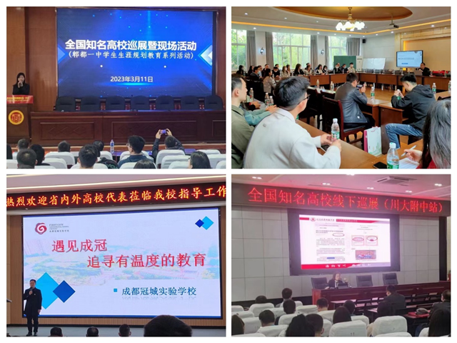 3月10日至11日,招生组参加了由四川青作协主办的“2023年四川省高校招生现场咨询会”,先后赴成都八中、川大附中、郫都一中、成都七中(万达)四所中学开展招生巡展咨询。巡展开始前,为进一步全方位了解中学,招生组听取了各中学的汇报,中学领导们分享了包括办学历史、校园特色、现有生源情况、毕业生情况、中学和高校共建方向等在内的多方面内容。