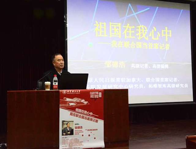2017年12月14日晚,“祖国在我心中——我在联合国当首席记者”主题讲座,在中关村校区研究生楼101报告厅成功举办。本次讲座由《人民日报》驻联合国原首席记者邹德浩作为主讲嘉宾,由bat365中文官方网站副书记副院长张宏亮主持。