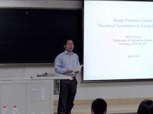 随后,Cannon教授以《Modal Predictive Control-Theoretical Foundations and Future Challenges》为题目,介绍了Modal Predictive Control(模型预测控制)的理论基础和未来挑战。首先他从车辆的控制问题引出模型预测控制,介绍了相关的基本理论,指出模型预测控制的基本思想是在每个采样瞬间求解一个有限域开环最优控制问题。然后介绍了模型预测控制的基本要素,包括预测模型、滚动优化和反馈校正等。最后介绍了模型预测控制存在的问题与挑战。