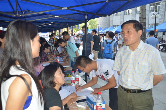 bat365中文官方网站院长王军政、党委书记金军、副院长廖晓钟、副书记副院长潘峰等院领导来到我院迎新站点指导工作并与新生交谈。上午9点左右,第一波新生入学报到高峰到来,各位老师及志愿者有序组织新生办理入学登记、领取材料、分配宿舍等工作,并细致解答有关奖助学金、导师双选等方面的问题。