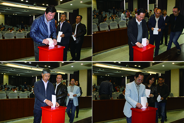 在庄严的音乐声中,学院党员代表们严肃认真的选出了自己心目中出席校党代会的学院代表,并郑重的将选票投入到票箱中。