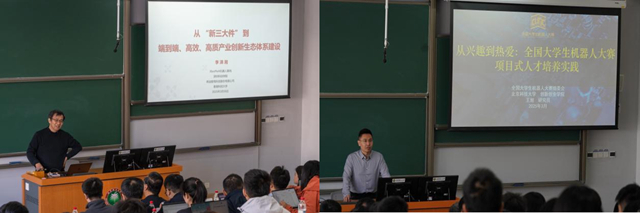 李泽湘在实地观摩排球机器人实战项目、听取双创班同学们的项目制学习与实践感悟后,以"从'新三大件'到端到端产业创新生态体系建设"为题发表主旨演讲。他系统阐述了教育链、人才链与产业链协同发展的创新路径,分享了其基于教改班、XbotPark机器人基地等形式构建可持续新工科人才培养战略的历程与观察分析。