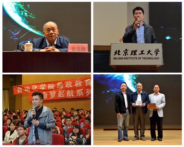 讲座中,徐老通过启蒙、学习、实践、实现四个阶段来分享他的“航天梦”。首先,徐老结合自身童年经历和艰苦的生活环境,通过朴实感人的成长故事向我们讲述了他的“航天梦”的启蒙阶段;接着,徐老讲述了“航天梦”追梦历程的学习阶段,北京理工大学的课内外培养激发了徐老“追梦航天”的热情,他指出,当年选择在北京理工大学就读自动控制系就是把他自己和他的“航天梦”联系在一起,北京理工大学很注重培养学生的国防意识。然后,徐老通过引用航天基地建设、航天空间站建设等航天工程相关案例,向我们生动的讲解了他的“航天梦”的实践历程,并饱含激情的分享了在酒泉卫星发射基地的相关经历和自译俄语参考书进行导弹研制的小故事。最后,徐老通过在航天基地的经验,向我们讲述了在卫星发射过程中克服重重技术障碍最终成功发射的故事,并根据当前国际形势分析了现阶段我国发展北斗导航、空间站的必要性。徐老强调,质量就是航天的生命,要达到国际的先进水平,我们就必须要有科学严谨的态度和协调配合的精神,在载人航天系统过程中要做到“不留遗憾,不留隐患”,并鼓励大家努力投身于国防科技事业,为党和人民做出自己应有的贡献,做一名有主见、有信心、有方向的有志青年。徐老包含激情的演讲赢得了全场的阵阵掌声。